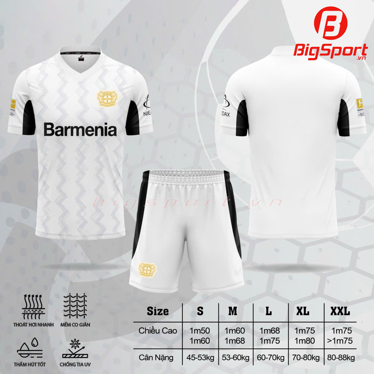 - Cấu trúc vải hai chiều với các đặc tính thấm hút tốt và có giản linh hoạt tạo sự thoải mái thoáng mát cho các cầu thủ khi tập luyện và thi đấu ở cường độ cao.