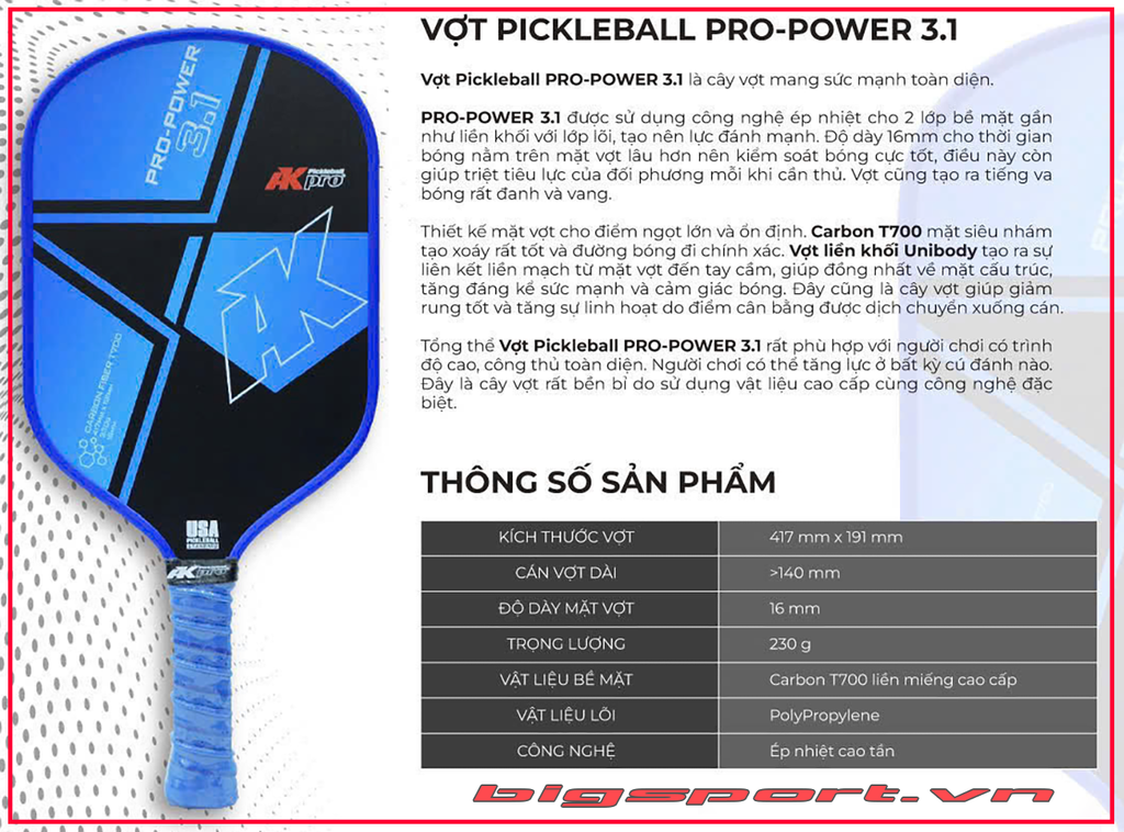 Vợt Pickleball Akpro Pro Power 3.1 Carbon T700 chính hãng